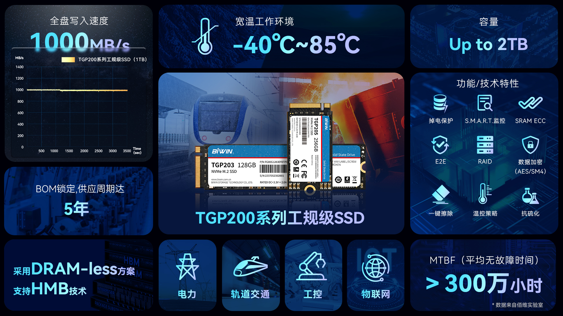 近日,佰維存儲面向軌道交通、工控、數據通信、電力等工業領域,推出了工規級寬溫SSD——TGP200系列。TGP200系列SSD采用了DRAM-Less設計,兼顧-40°C~85°C寬溫工作、-55°C~95°C寬溫存儲、斷電保護(PLP)等特性,MTBF高達300萬小時,讀寫速度分別高達3400MB/s、2900MB/s,滿足嚴苛工業環境下數據高效可靠存儲要求。