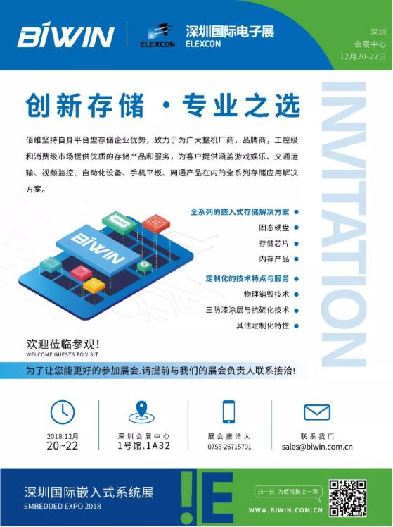 2018年12月20至22日,華南區(qū)重要的電子與嵌入式領(lǐng)域的專業(yè)展覽,深圳國(guó)際電子展暨第七屆深圳國(guó)際嵌入式系統(tǒng)展將在深圳會(huì)展中心舉行。BIWIN以“創(chuàng)新存儲(chǔ),專業(yè)之選”