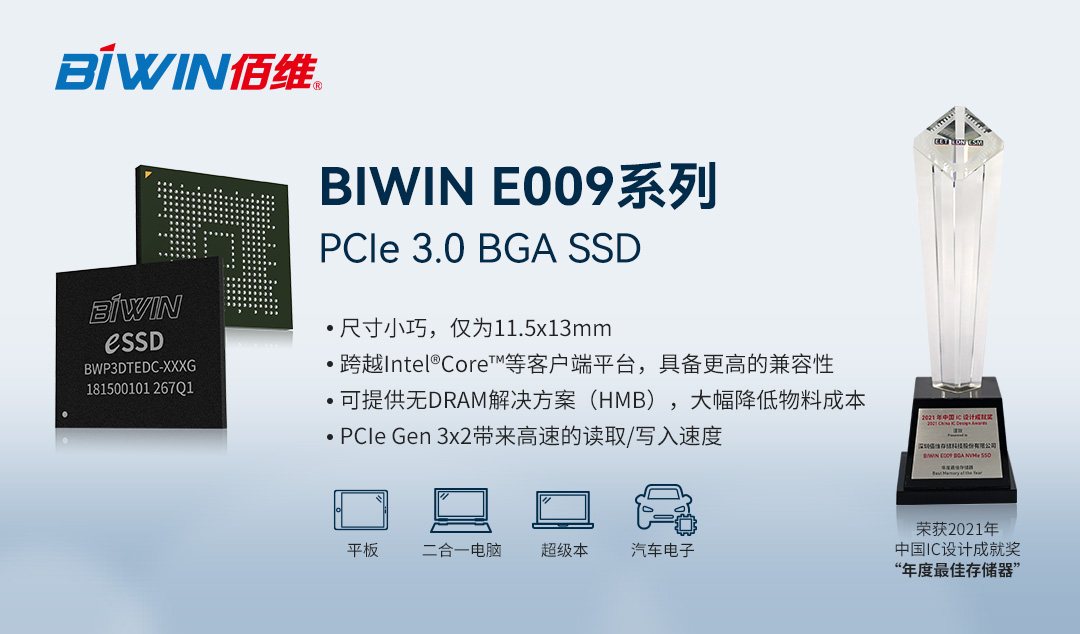 佰維立足“端”應用存儲需求,在存儲介質特性研究、核心固件算法、存儲器設計與仿真、存儲芯片封裝工藝、自研存儲芯片測試設備與算法等核心技術的支持下,打造了豐富的BGA SSD產品體系。比如公司推出的E009系列,順利通過Google Chromebook認證,并榮獲"2021中國IC設計成就獎年度最佳存儲器”大獎。